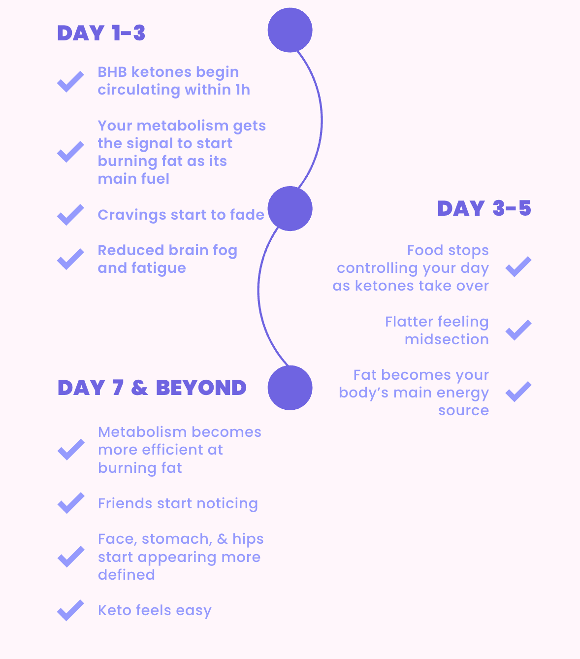 Yes — many women report fewer cravings and more stable energy within the first few days. That’s because MCTs and BHBs fuel your brain and body with ketones, reducing reliance on glucose spikes that cause hunger and fatigue.